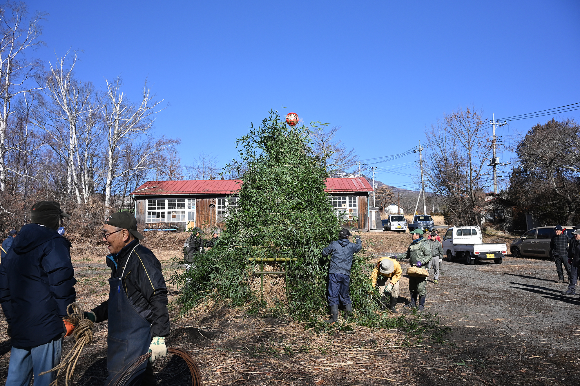 まずは芯になる3本の柱を組んで櫓とします。心棒の青竹の先にはダルマが鎮座。