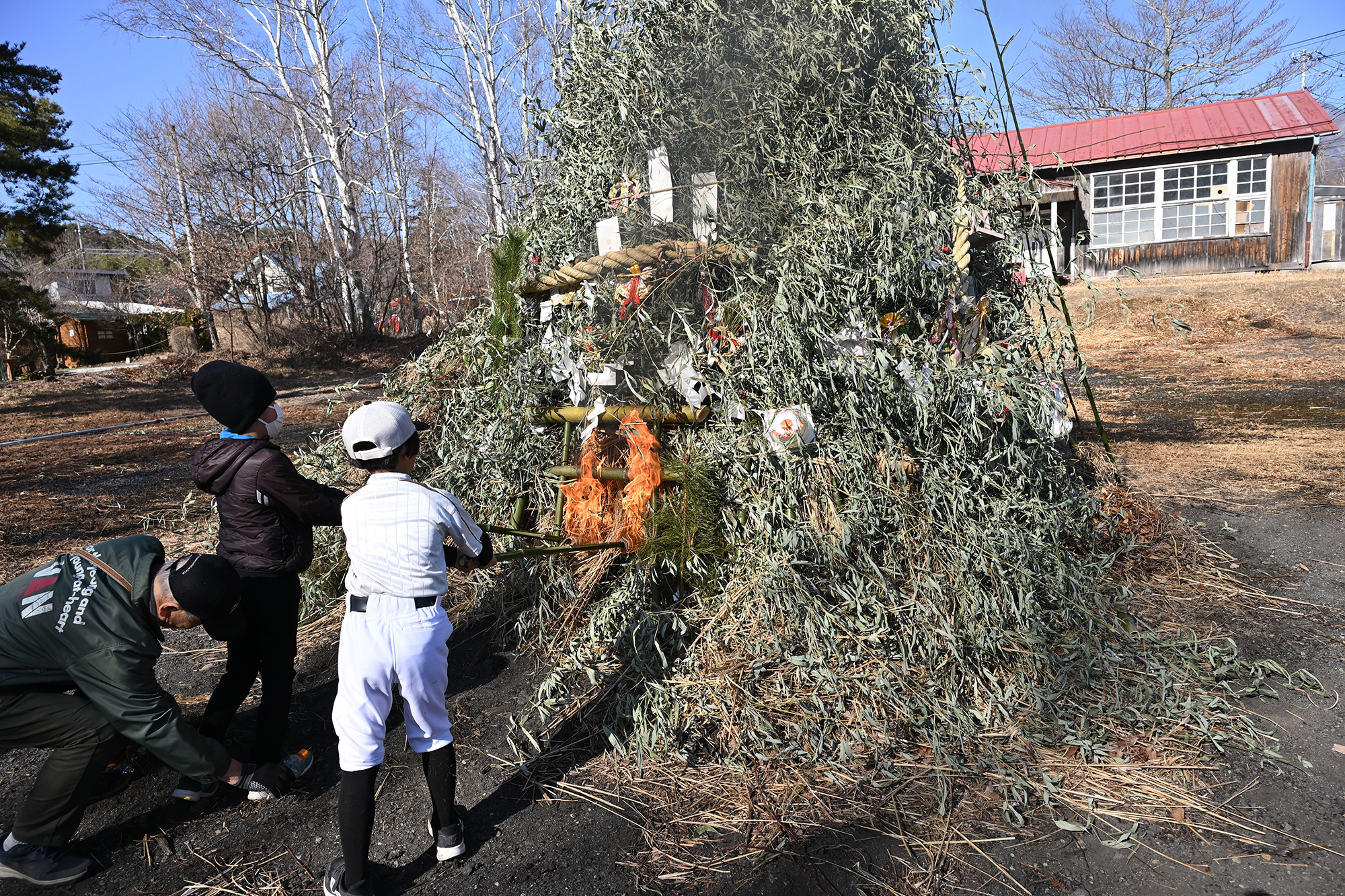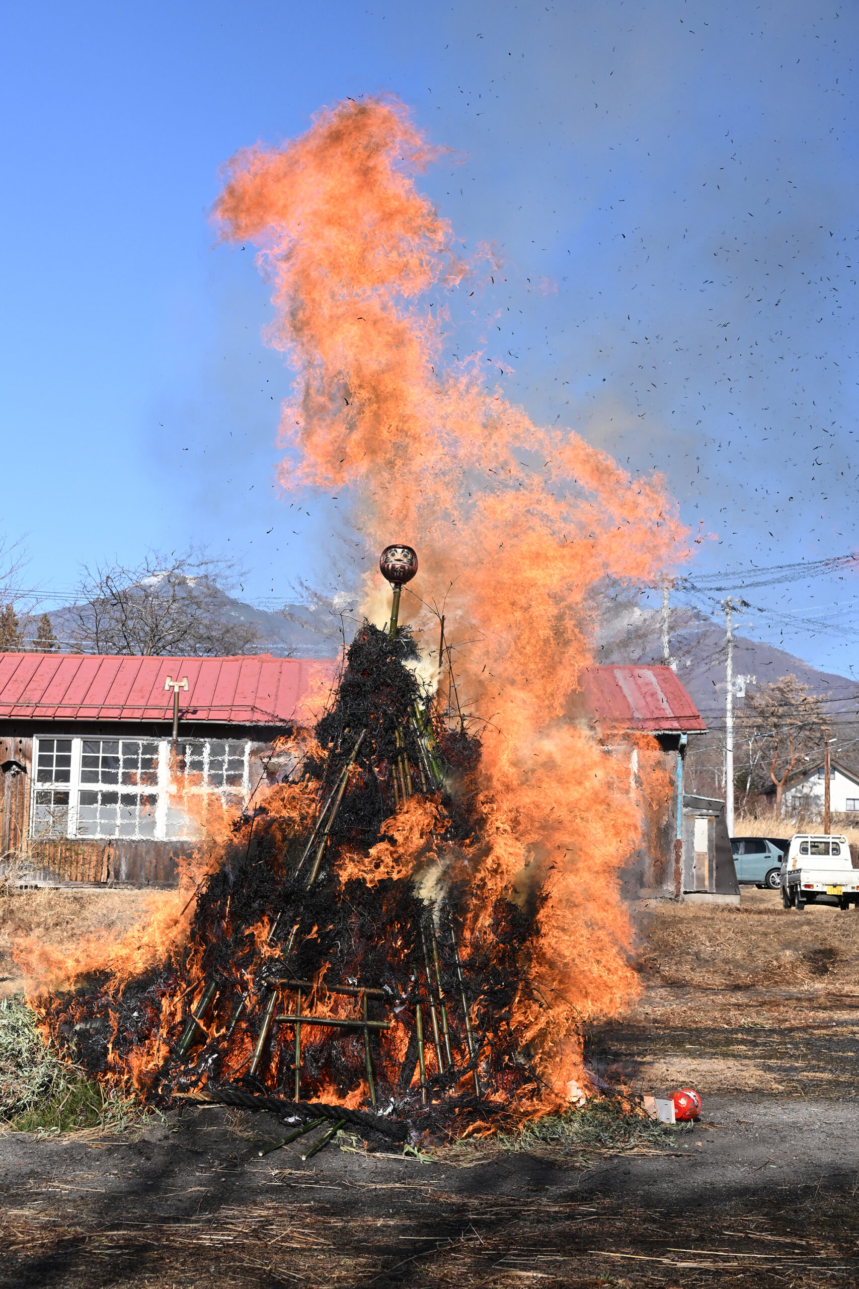 行事で予定していた甘酒などのお振舞い、健康祈願の繭玉焼きは行わず、櫓の撤去を兼ねたお焚き上げのみ行いました。
