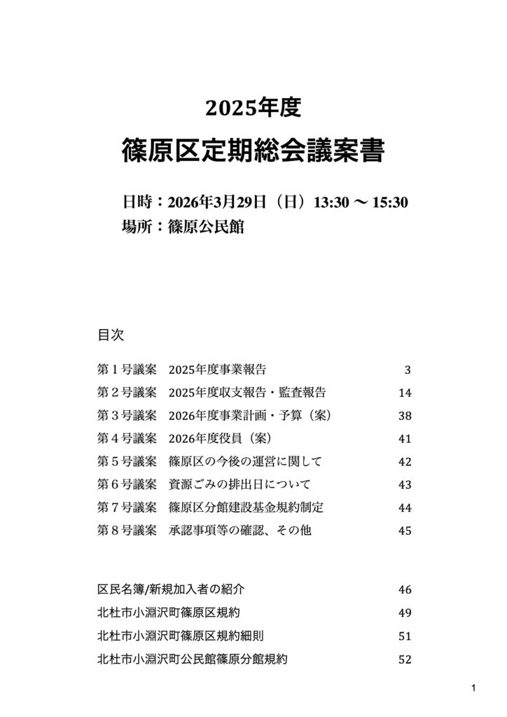 篠原区定期総会のお知らせ P 2026年3月11日 , by kominkan K お知らせ, 公民館, 役員会 令和8年(2026年)篠原区定期総会を下記の日程で開催いたします。 区民の皆様におかれましては万象お繰り合わせの上御出席賜りますようごん案内申しあげます。 開催日時 令和8年3月29日(日曜日) 13時30分〜15時30分 場所 篠原公民館 総会議案書は3月第3週くらいから全戸回覧で配布予定です。 総会に欠席なさる方は3月25日(火)までに各組長あて提出をお願いいたします。